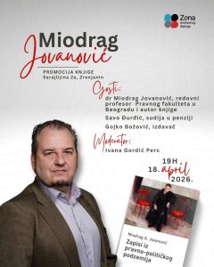 Beograd, 17. aprila 2026. – Razgovor o knjizi Miodraga Jovanovića Zapisi iz pravno-političkog podzemlja održaće se u subotu 18. aprila u Zoni društvenog dijaloga (Sarajlijina 2a) u Zrenjaninu s početkom u 19 časova.